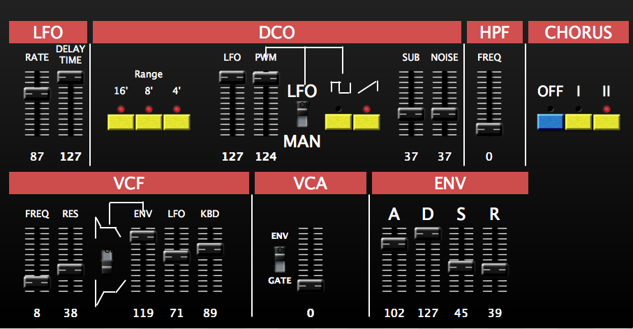 A simple panel for Roland Juno 106. It does not handle program dumps but editing should work in both directions. Uses SysEx.
