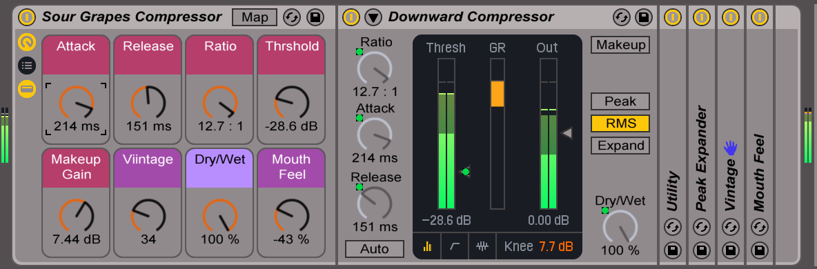 An attempt to quasi-emulate a hardware compressor. The makeup gain feeds into an expander and then a saturator and subtle dynamic tube giving you a compression curve similar to older hardware versions. If you have a slower attack it means your transients will kick into the expander and really slam into the saturators for an extra splash.