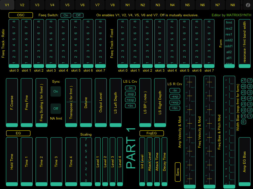 Some parameters are only applicable based on other parameter settings. I tried to capture these, however I did a much better job with the effects section and later in the editor. If you look at the FX pages you will see color coding for each slider. This is because the effect parameters on the FS1R share the same sysex but do different things depending on which effect is selected.