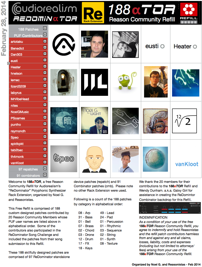 Welcome to "188aTOR", a free Reason Community Refill for AudioRealism’s “ReDominator” Polyphonic Synthesizer Rack Extension; organized by Noel G. and Reasonistas. This Free Refill is comprised of 188 custom designed patches contributed by 20 Reason Community Members whose PUF user names are listed below in alphabetical order.