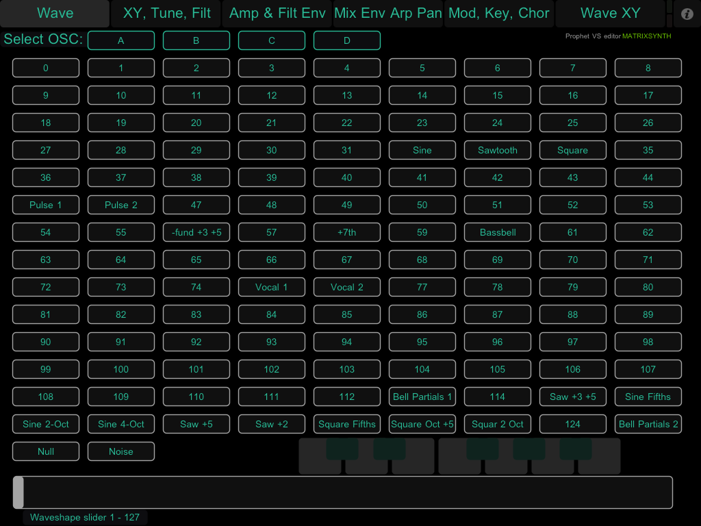 The cool thing about this editor vs. editing directly on the Prophet VS is you can jump values. With the VS you select a parameter and use the slider to adjust, meaning to get from 15 to 120 you have to scroll through all values from 15 to 120. With this editor you can switch directly to 120 or any other value. I also created an XY pad for waveform selection, so instead of being limited with the onboard joystick for mix levels of the four oscillators only, you can use the additional XY pads for waveform selection (see bottom pic). Again you can jump parameters with the XY pads for both mix levels and waveform selection. This is not possible on the Prophet VS directly. And of course you can jump other slider values like cutoff frequency, resonance, and others. This allows you to play parameters in real time including creating manual rhythmic effects not possible on the VS directly.