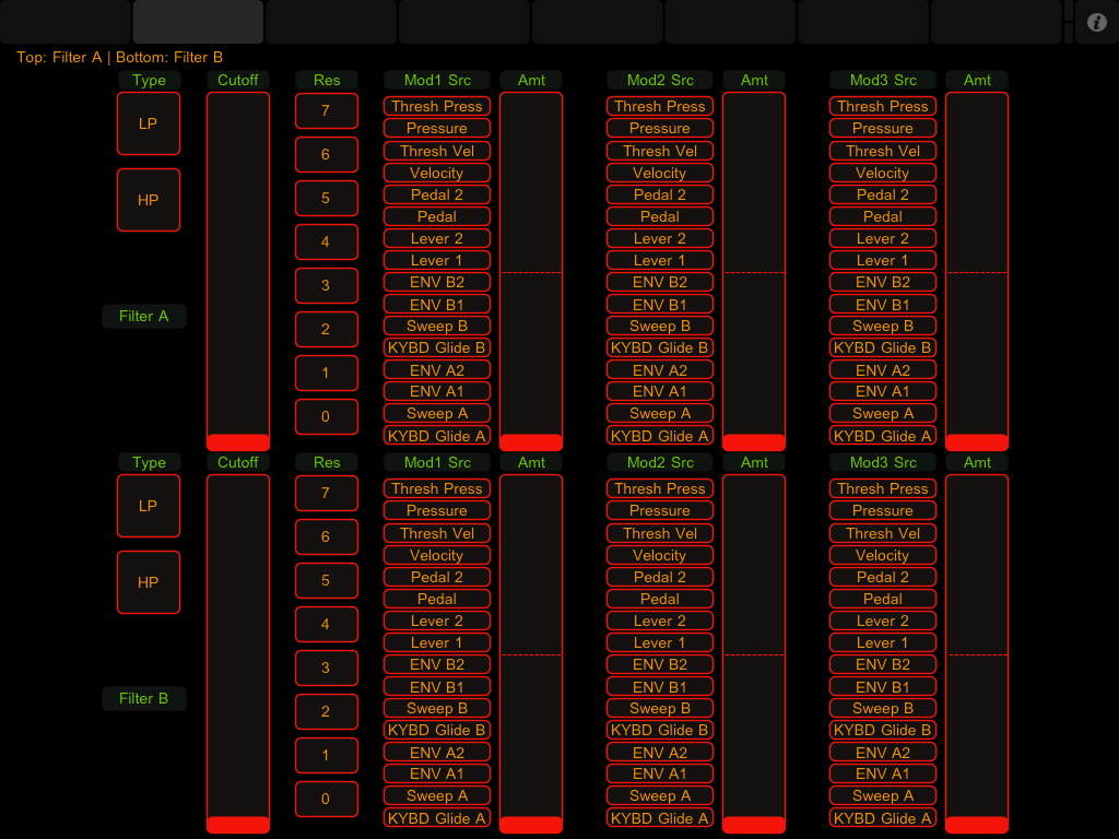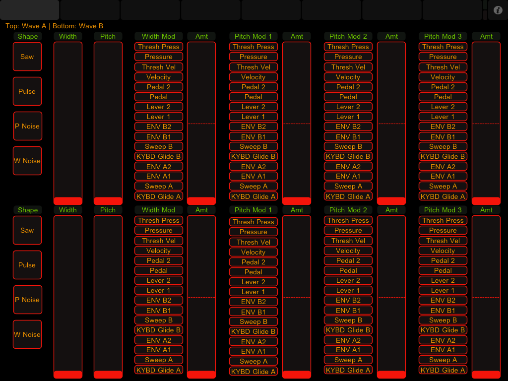One for The Missing Link and two for OSCulator. Click the images for the full size screens. They will show you every editable parameter on the Chroma. The template interfaces for The Missing Link and OSCulator are exactly the same. The only difference is in the message format each sends. You can find a video of the previous template in this post. It's roughly the same but I switched out sliders for toggles where appropriate for finer control over the parameters.
