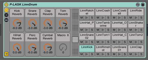 This is a Drum Rack preset I made using only stock Ableton Live devices. Certain subgroups of drums have been bussed through an internal Reverb and EQ. Therefore, you can use the Macros to add reverb in varying amounts to various drum subgroups.