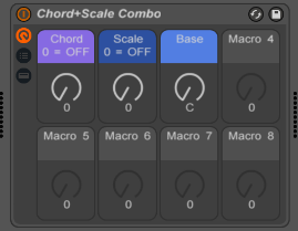 The three macro knobs allow for quick scrolling through several chord and scale presets, as well as setting the base on the scale preset. When the knobs are set to 0 (full left) they will bypass the chord or scale midi effects.