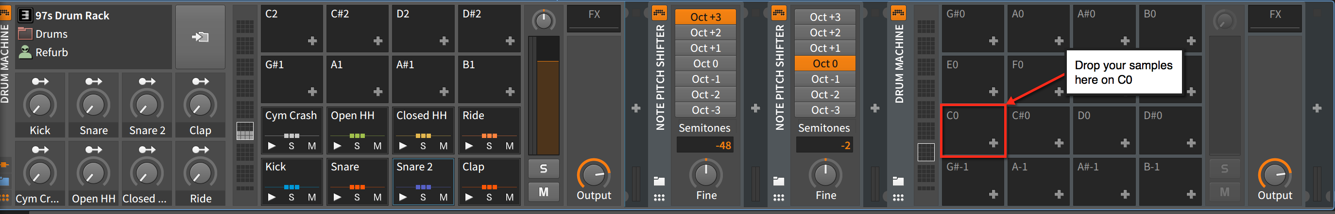 So using nested Drum Machines and the Note Pitch Shift device, I've created a rack that will allow you select from up to 97 samples with a macro knob. You'll need to load your samples in each nested rack. You can fill slots from C0 to C8 (97 total slots).