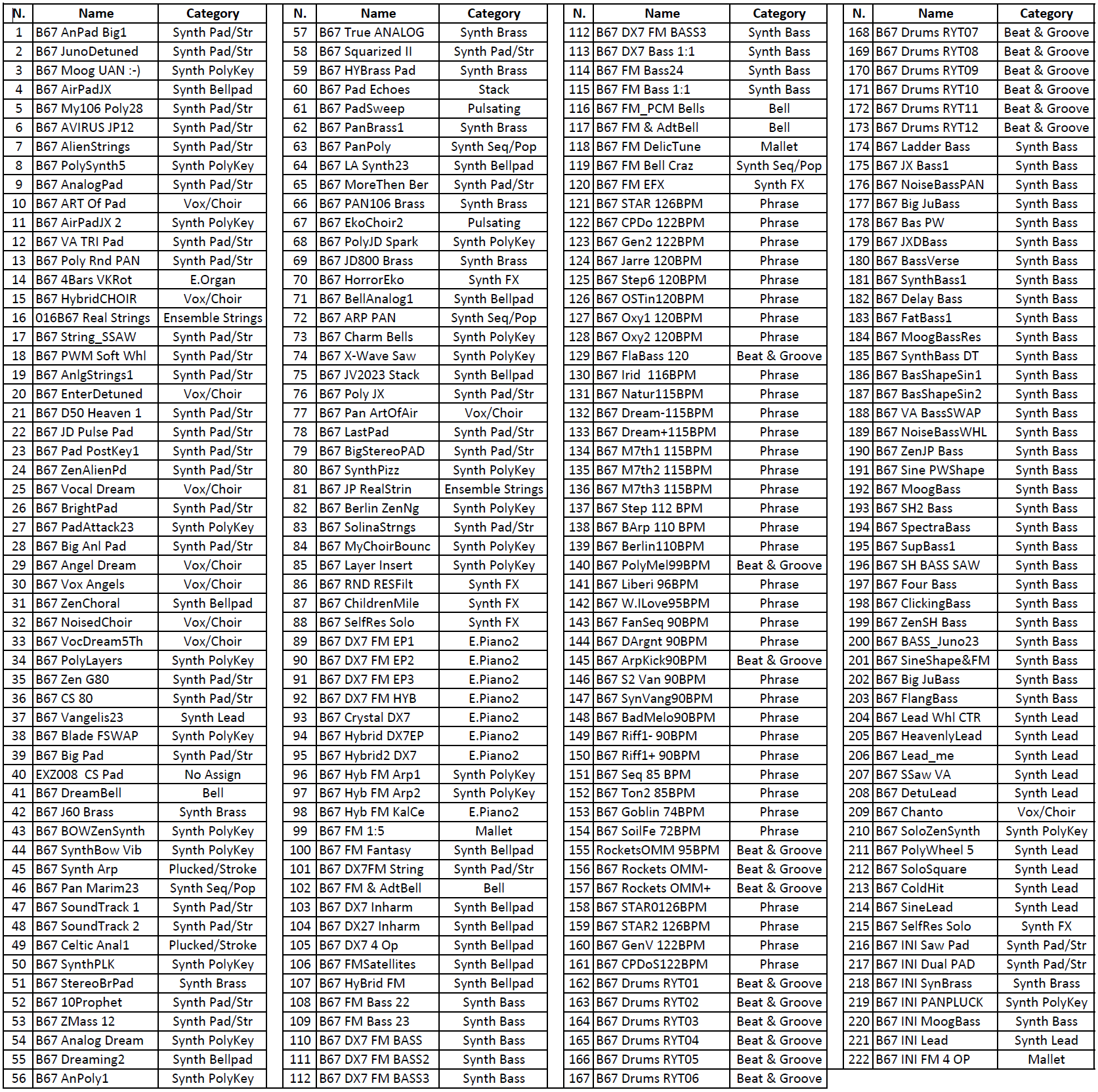 The collection includes, among the various sounds: - 53 ZEN-Core tones containing 4-voice melodic and rhythmic sequences, synchronized with the scene BPM. thanks to the simultaneous use of 8 STEP-LFOs (2 per partial) and 128 overall steps - 32 linear FM tones, some created with 4 operators (double carrier-modulating pair) and some composed of a pair of FM partials and partial PCM -30 Bass Synth tones