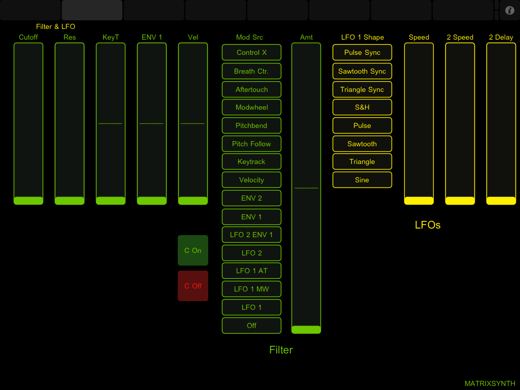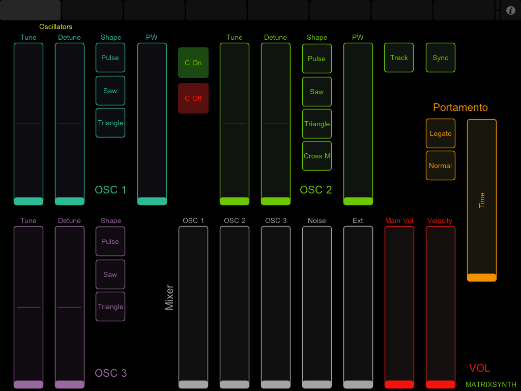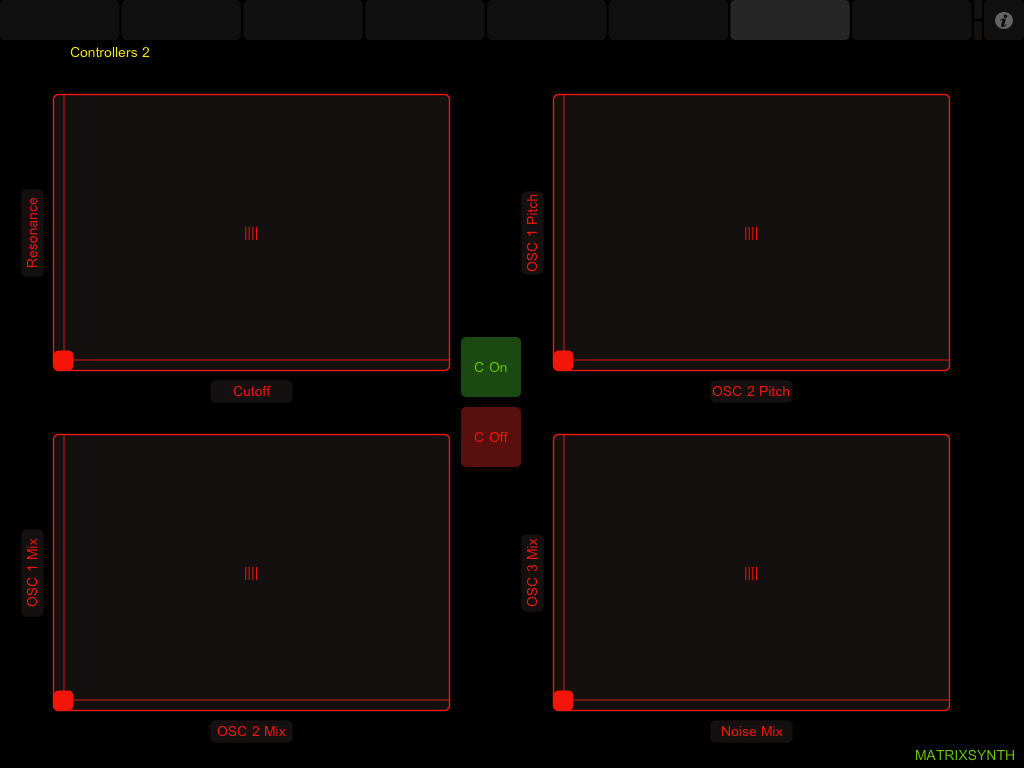 Below are screens for each page of the template in order. You can also find the template and on wifimidi.com. You can find more info on The Missing Link wireless TouchOSC to MIDI box here. Click the screens below for the full size shots. Also see my Rhodes Chroma editor.