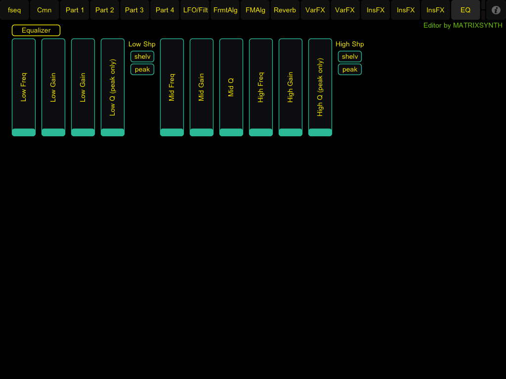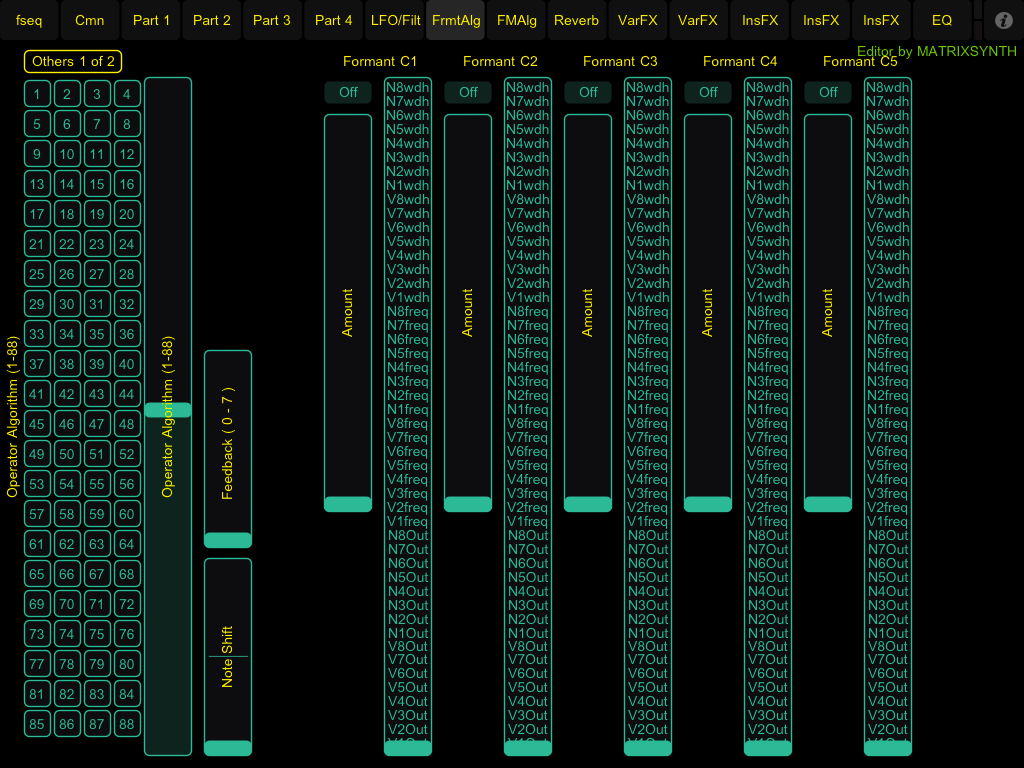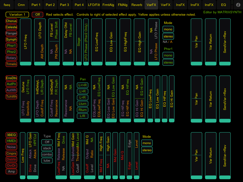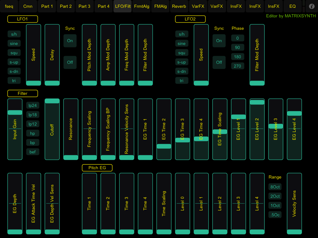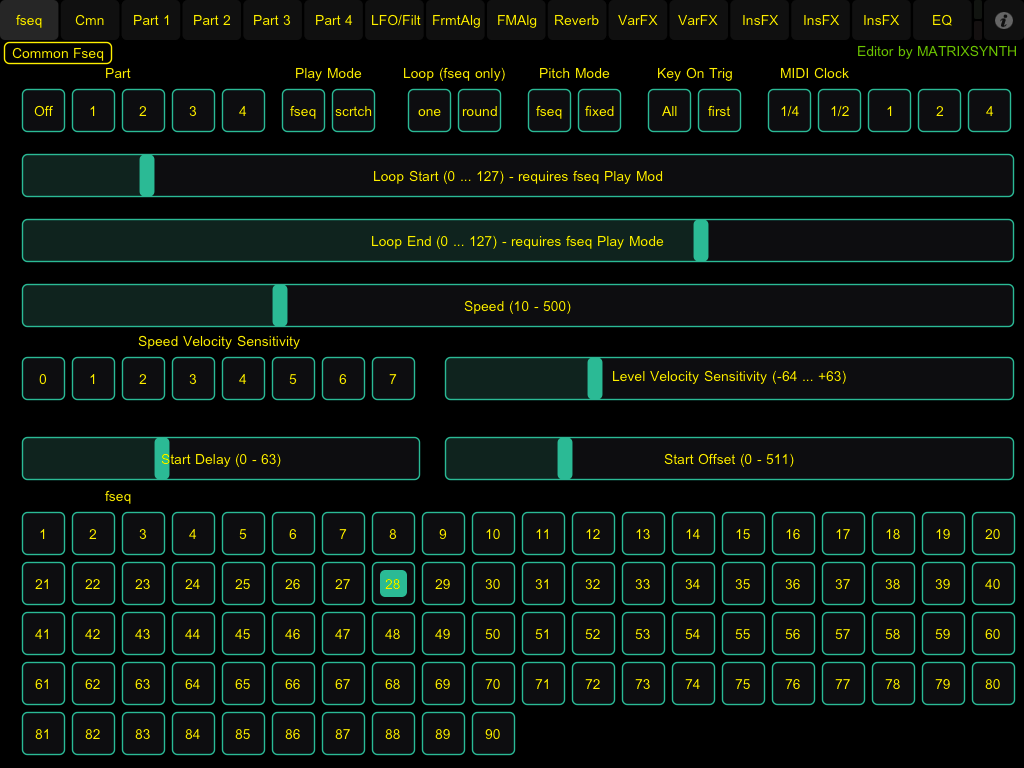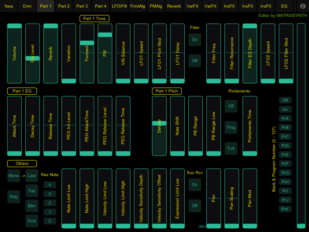 Main editor (16 pages/tabs): fseq editing, common controls, Part1 control (if you look at the tabs you can see Part2 - 4 as well), LFO & Filter, Formant Algorithm selection, FM Algorithm selection, Reverb, Variation Effects (two pages), Insert Efects (three pages), and EQ.