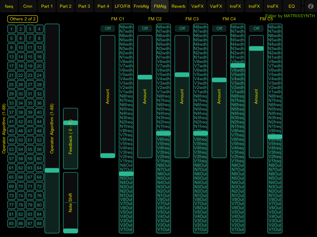 As with all TouchOSC based editors, you can also jump values, while on the FS1R there is no number pad so you have to go the full range from point a to point z. If you look at the Algorithm screens for example you can see with this editor you can directly select any algorithm you want.