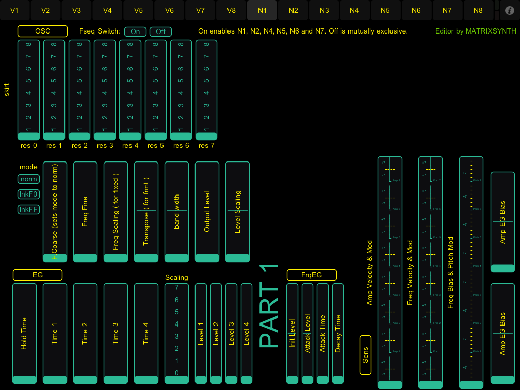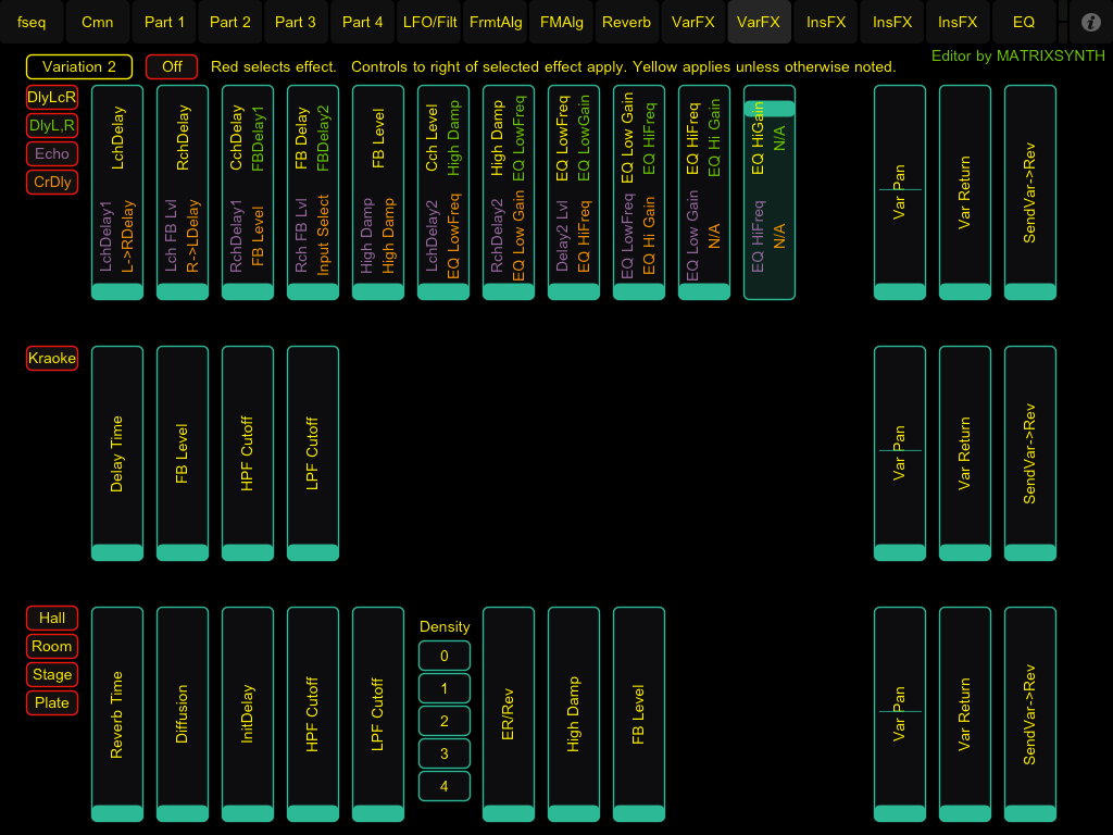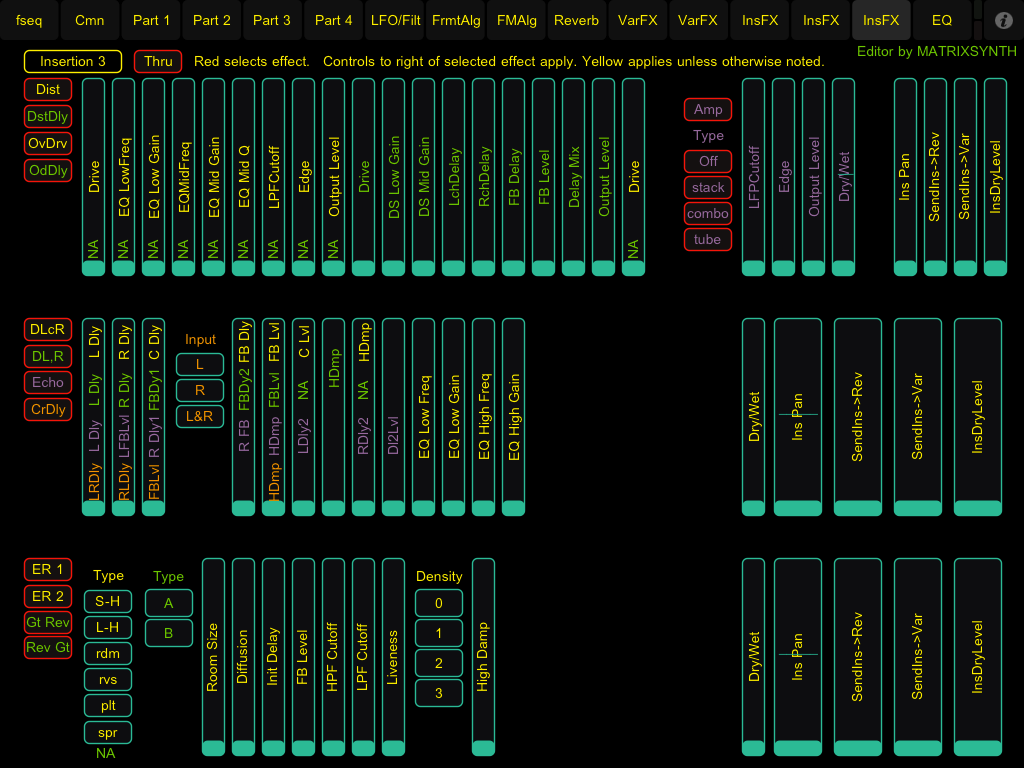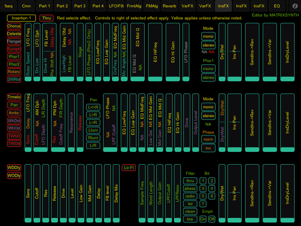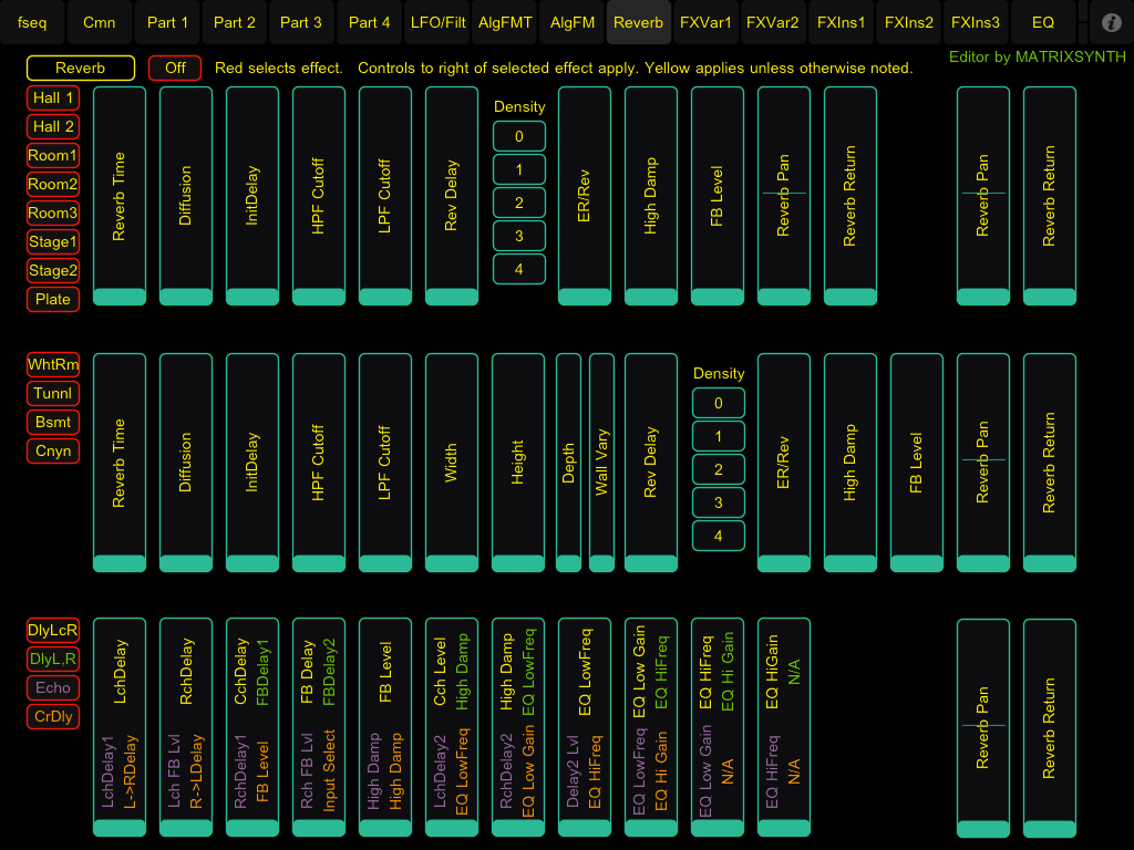 Some parameters are only applicable based on other parameter settings. I tried to capture these, however I did a much better job with the effects section and later in the editor. If you look at the FX pages you will see color coding for each slider. This is because the effect parameters on the FS1R share the same sysex but do different things depending on which effect is selected.