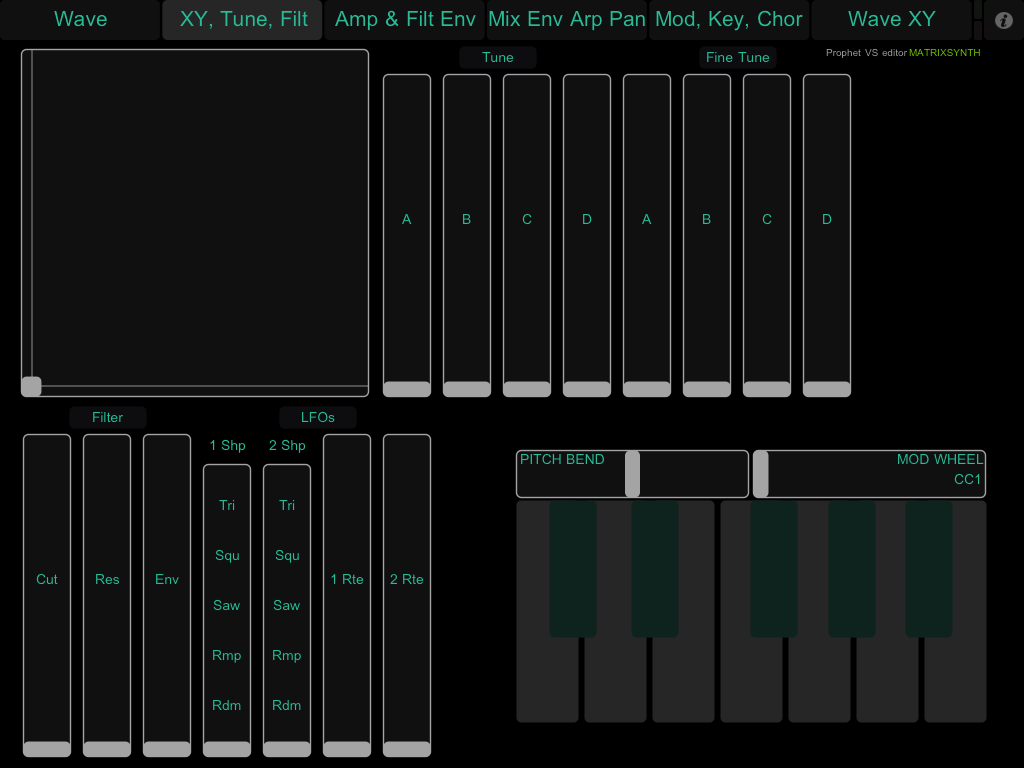 The cool thing about this editor vs. editing directly on the Prophet VS is you can jump values. With the VS you select a parameter and use the slider to adjust, meaning to get from 15 to 120 you have to scroll through all values from 15 to 120. With this editor you can switch directly to 120 or any other value. I also created an XY pad for waveform selection, so instead of being limited with the onboard joystick for mix levels of the four oscillators only, you can use the additional XY pads for waveform selection (see bottom pic). Again you can jump parameters with the XY pads for both mix levels and waveform selection. This is not possible on the Prophet VS directly. And of course you can jump other slider values like cutoff frequency, resonance, and others. This allows you to play parameters in real time including creating manual rhythmic effects not possible on the VS directly.