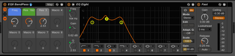 Nothing too scientific here. Sometimes the auto filter bandpass doesn't seem to be wide enough at higher resonance, so I built this EQ Eight preset as a starting point for a wider bandpass filter.
