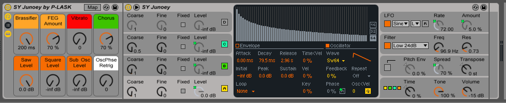 Anyway, it inspired me to open up one of my old Operater patches, called "Junoey," and rework it into a more functional Instrument Rack. I've added macros to increase/decrease the "brassiness" of the sound, as well as to control vibrato, filter env amount, and the all-important "chorus" effect. There are also 3 macros dedicated to controlling the mix between the Sawtooth, Pulse, and Sub oscillator levels. Finally, you have a control for activating or deactivating the oscillator phase re-trigger for all oscillators. Oh yeah, and the Mod Wheel has been mapped to adjust filter cutoff.